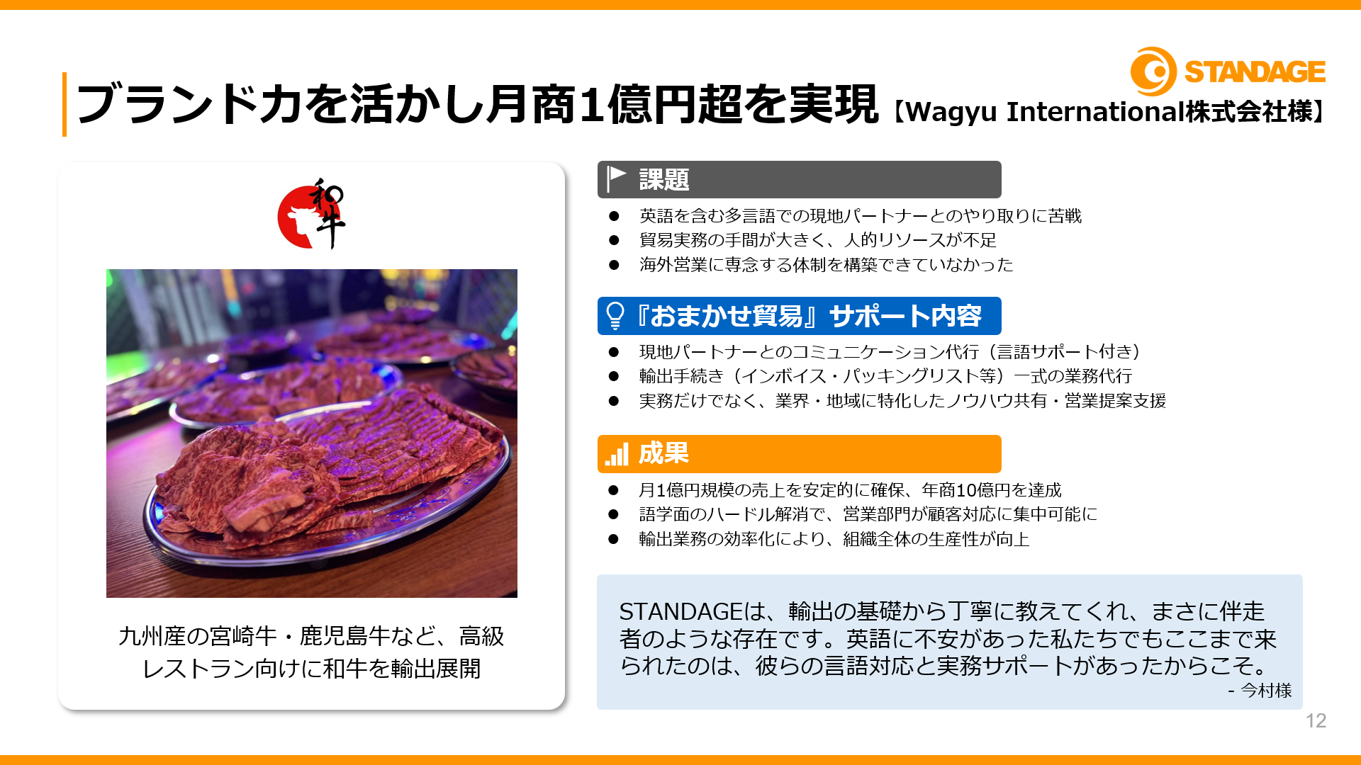 宮崎牛や鹿児島牛などの九州産高級和牛を取り扱う大阪府のWagyu International株式会社は、『おまかせ貿易』の導入で、月1億円もの売上を達成することに成功しました。
