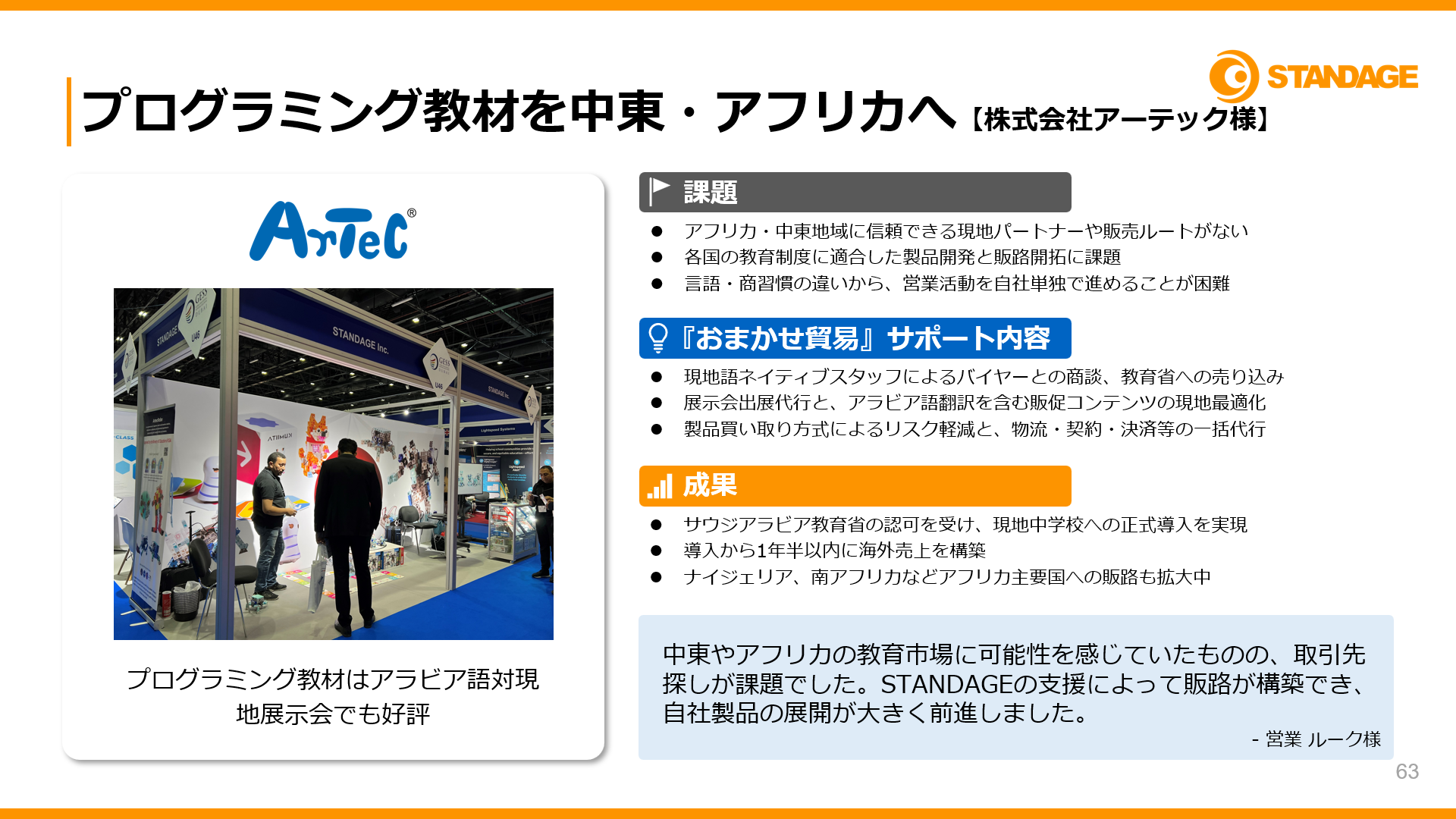 プログラミング教材メーカーである大阪府の株式会社アーテックは、『おまかせ貿易』の導入で、サウジアラビアでの売上創出に成功しました。