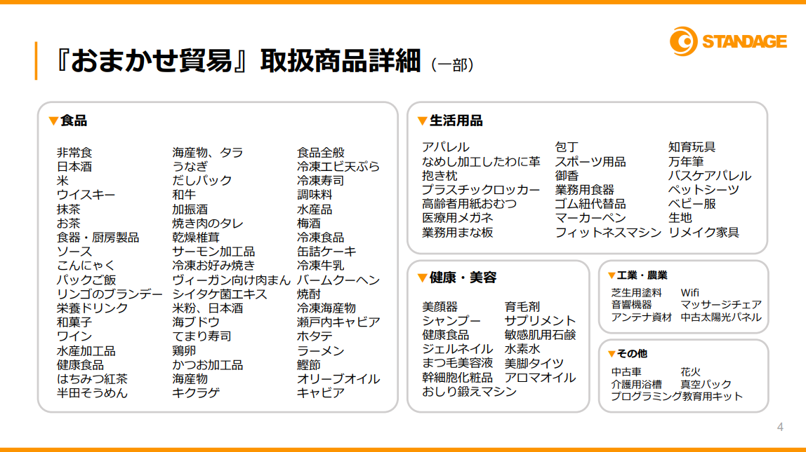 基本的には幅広い商品に対応可能です。400社以上の『おまかせ貿易』の導入により、サービスで取り扱う商材も年々幅広くなっています。