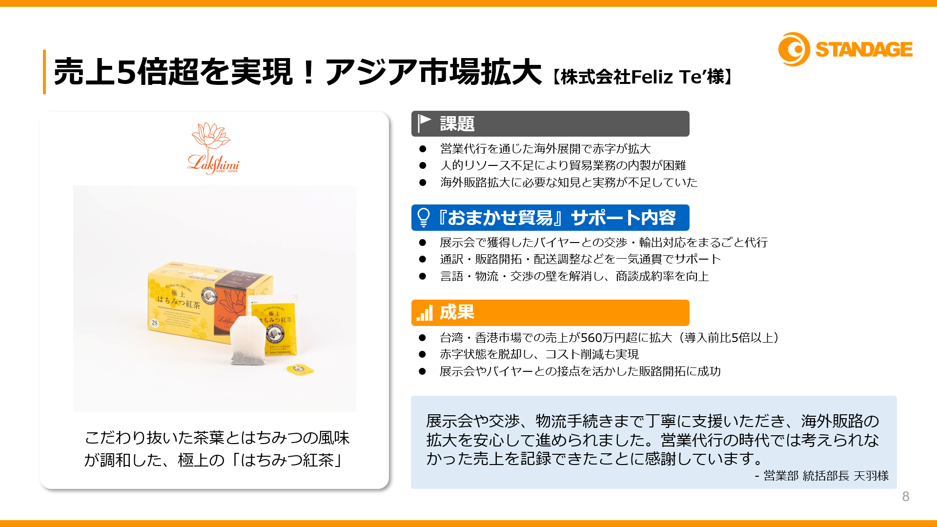 兵庫県のはちみつ紅茶メーカーである株式会社Feliz Te’は、『おまかせ貿易』の導入により、台湾・香港市場での売上を導入前比5倍に押し上げることに成功しました。